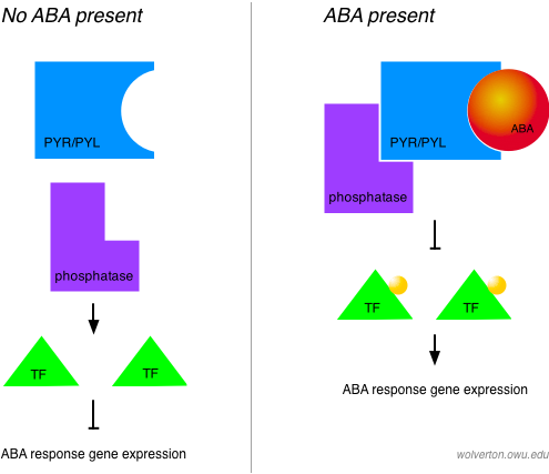 At least one ABA receptor has been identified to date in plants. The PYR1 gene encodes a protein that can bind ABA and inactivate a protein phosphatase in the PP2C class. Protein phosphatases remove phosphate groups from target proteins, often inactivating them. The result of inactivating this phosphatase is to stimulate ABA responses, the earliest of which include activation of ABA-specific transcription factors. So we can think of ABA as inhibiting an inhibitor of ABA signaling — when the inhibitor (a PP2C protein) is inhibited, ABA signaling can proceed.